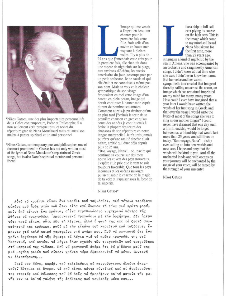 Au printemps 1986, Nana revient en tournée pour nous présenter deux nouveaux albums: "Ma vérité" et "Alone". Sa popularité ne se dément pas. Au Québec, par exemple, elle en est à son quatrième grand succès consécutif: "L'amour en héritage", le thème d'une série télévisée. D'ailleurs, le 45 tours est considéré comme le sixième plus populaire de 1985. Au début de cette année, à sa grande satisfaction, la version anglaise, "Only Love", s'est hissée en tête des palmarès britanniques. En entrevue, Nana nous annonce qu'elle vient d'enregistrer "Je reviens chez nous", de notre chansonnier Jean-Pierre Ferland, en cinq langues. Et en coulisses, elle parle de son tout premier 33 tours en espagnol qui doit sortir au cours de l'été.