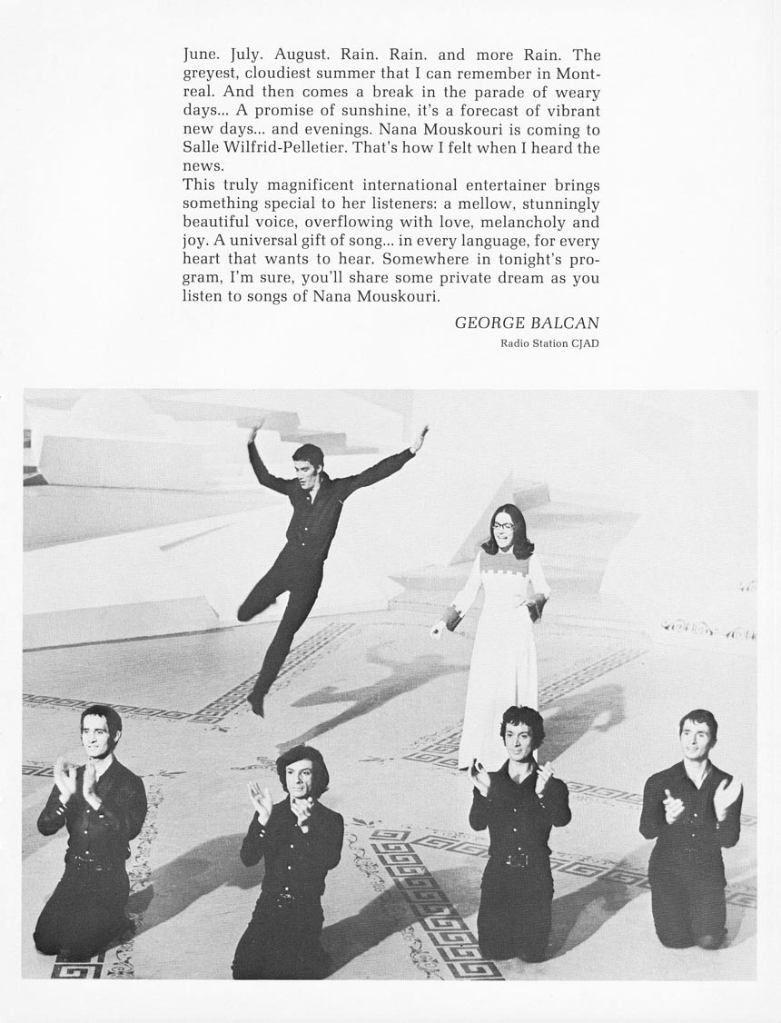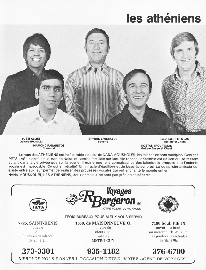 That fall, after two years’ absence, Nana and The Athenians return to perform for Quebecers. This fourth tour is a great success. However, it will be the last one through the province. During their subsequent returns, they'll perform running during several evenings in Montreal and in Quebec City.