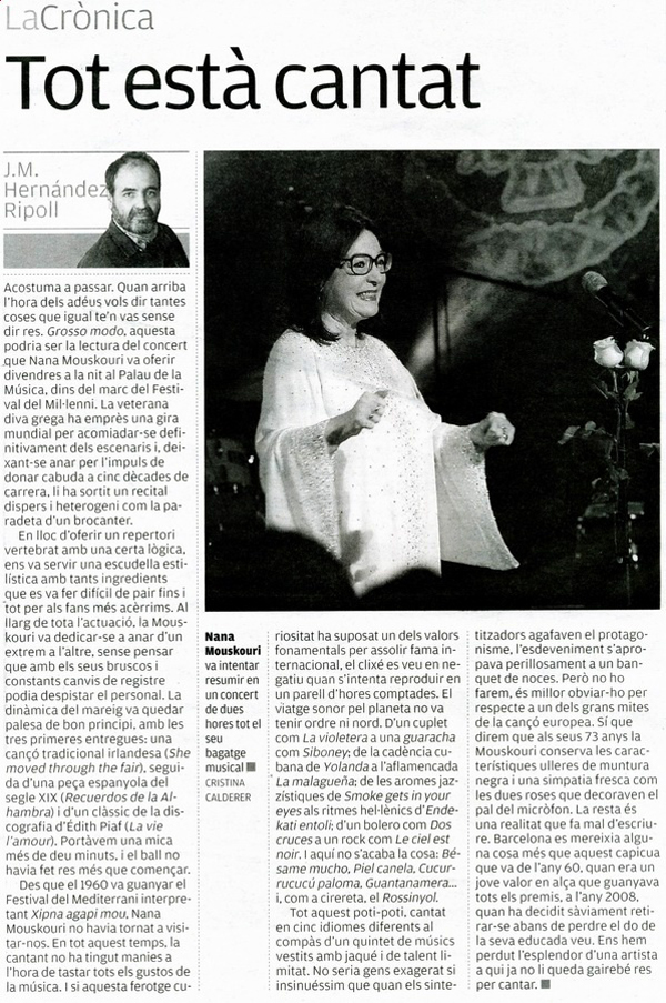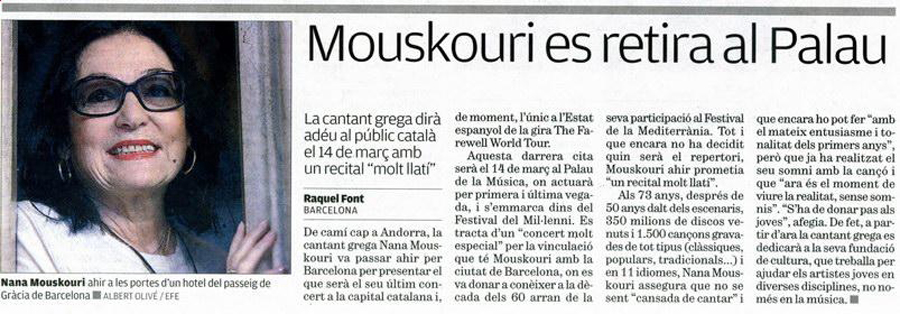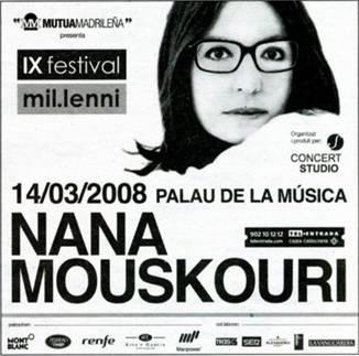 Im Zusammenhang mit dem 9. Winterfest von Barcelona zählt Nana unter mehreren anderen zu den internationalen Künstlern, die eingeladen wurden, sich zu produzieren. Es ist im großartigen Palau de la Music voll besetzt. In diesem Palast, wo man in diesem Jahr die Hundertjahresfeier beging, gab sie ein außergewöhnliches Konzert. Ein echter musikalischer Marathon von 2,15 Stunden, ohne Pause – eine Leistung am Anfang dieses olympischen Jahres.