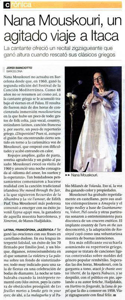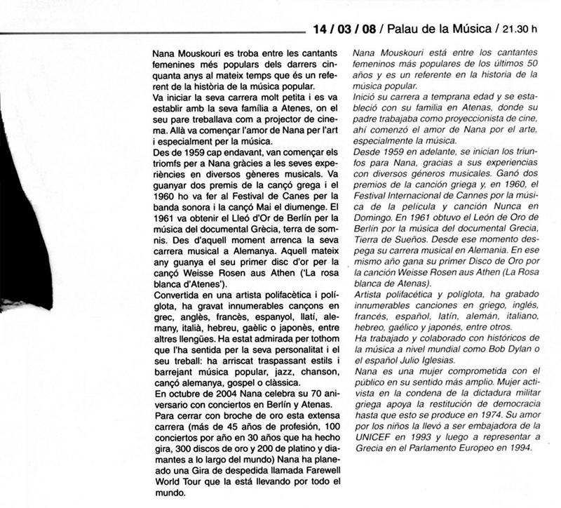 Während des ganzen Konzertes war Nana in prächtiger Form. Mit einem strahlenden Vergnügen gab sie ihr Bestes. Sie entschuldigte sich, nicht genug die spanische Sprache zu beherrschen. Sie war immer sehr entspannt und zögerte nicht, um Hilfe von den Zuschauern in der Halle zu bitten, die Wörter zu finden, um zu erklären, dass sie des Konservatoriums von Athen verwiesen wurde, wo sie mit dem Jazz, Rock, der Folklore geflirtet hat; die Musik, die seinerzeit als weniger edel betrachtet wurde als die klassische Musik.