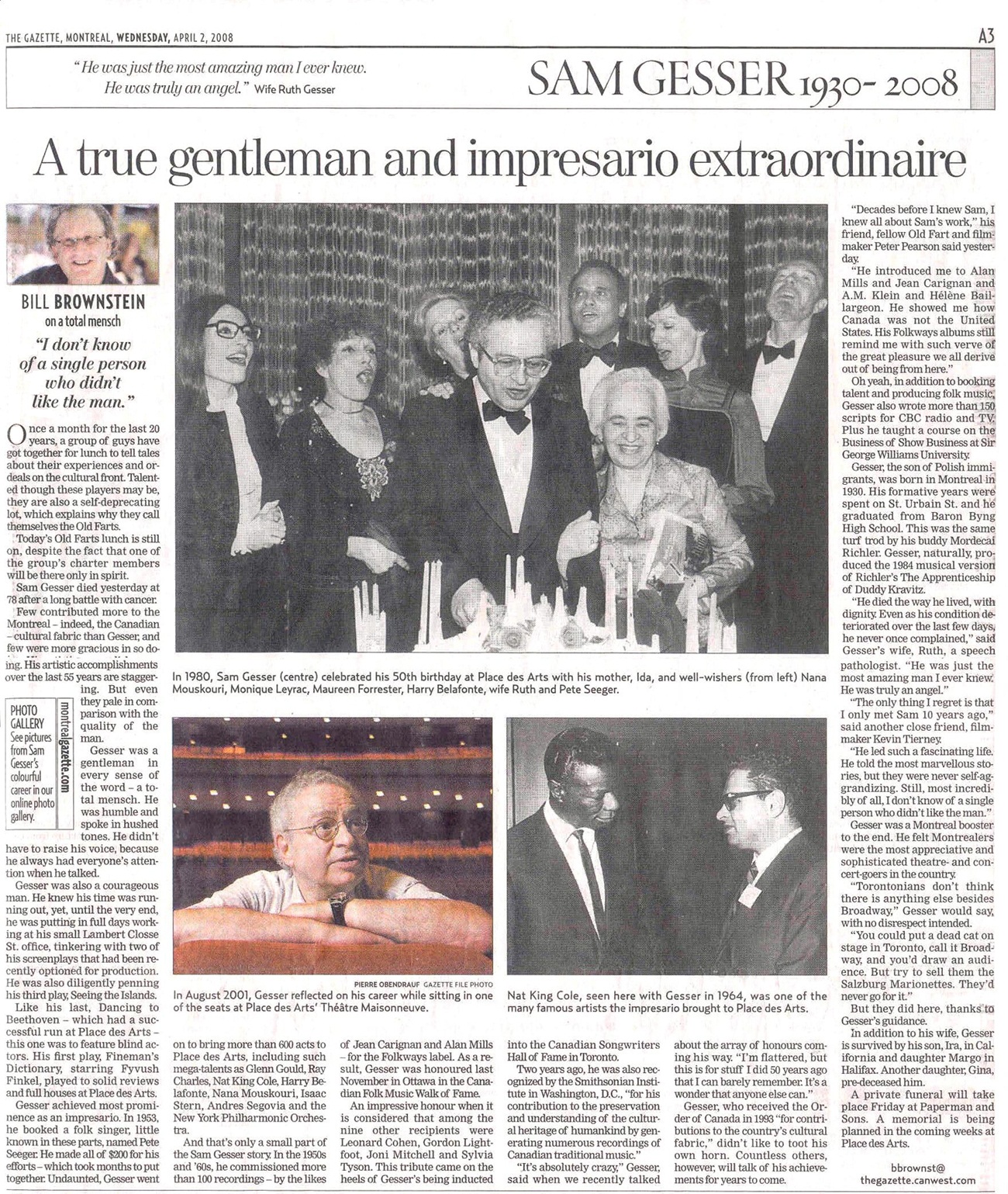Am 1. April 2008 starb der Manager aus Montreal Samuel Gesser im Alter von 78 Jahren. Im Laufe der Jahre stellte er mehr als 3.000 Schauspiele in Kanada vor, und er war Nanas Tourmanager von 1967 bis 1992. Ausdruck seiner Ausstellung an allen Arten von Musik war es, dass er einen sicheren Geschmack entwickelte. In seinen jungen Jahren nahm Samuel Gesser einige Lieder auf, was wenige Leute wussten. Er arbeitete auch in den Bereichen der Werbung und der Platte. Mit der Idee, die Künstler bekannt zu machen, was er wollte, wurde er Anfang der 60er Jahre Manager. Nana war wichtig für ihn. Er war stolz, sie als Künstlerin an das kanadische Publikum präsentiert zu haben. Obwohl er sich seiner Firma verschrieben hatte, sah man ihn an dem Tag, an dem der Vorverkauf begann, in der Theaterkasse und er ließ es sich nicht nehmen, Nana nach dem Konzert persönlich zu begrüßen. Danke Herr Gesser, danke für die Kultur, die Sie uns näher gebracht haben und danke dafür, dass Sie Nana so oft zu uns geholt haben. |