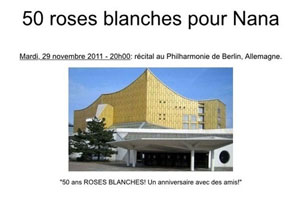 Three years after the end of her long farewell world tour, Nana Mouskouri makes her grand return on record and on stage. She presents initialy an album entitled "Tragoudia apo ta Ellinika nisia" (Songs from the Greek Islands) and a second one in which she sings in duet with big names in Music and Cinema. Then, she will see again her fans for two special concerts. In Berlin, she will celebrate the 50th anniversary of the song "The white rose of Athens". And in Bucharest, she will give a benefit concert for UNICEF. During this autumn 2011, we’ll have to follow Nana’s next appointments.
