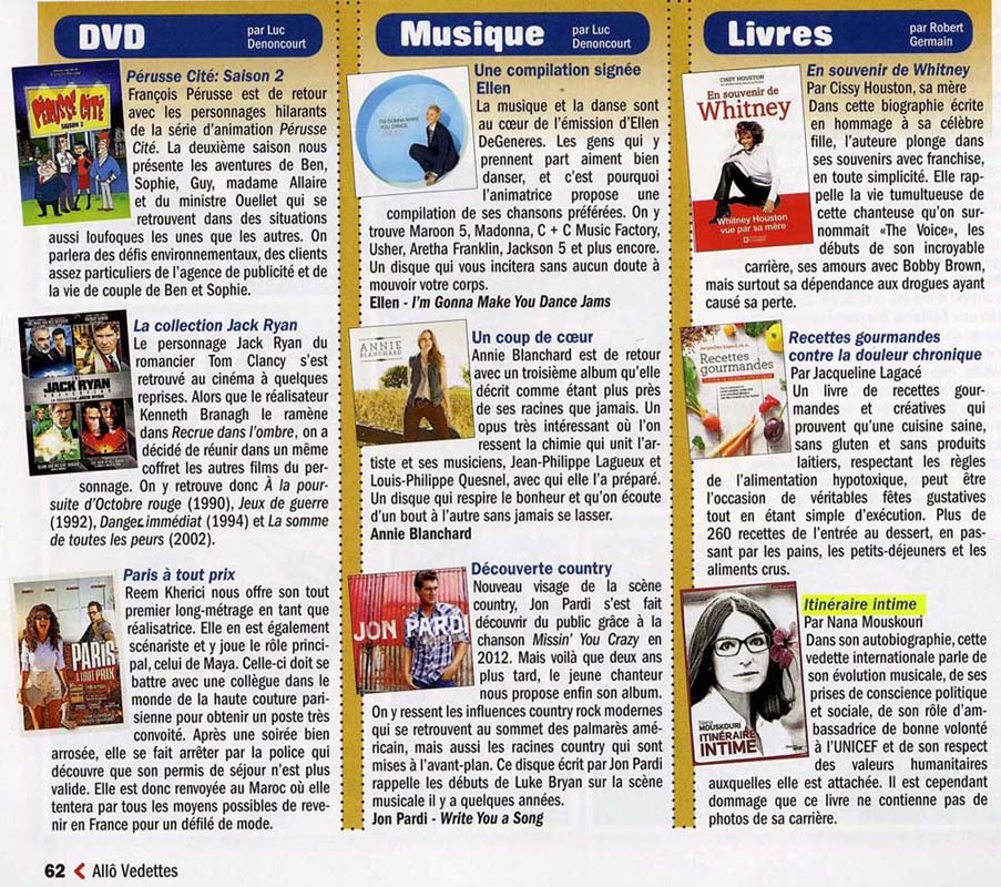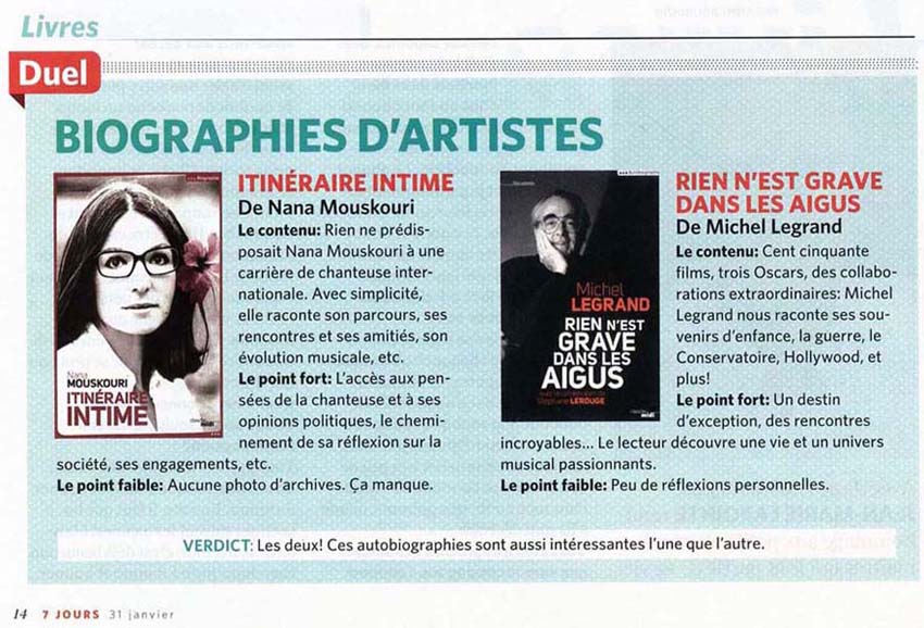 Die Autobiografie "Itinéraire intime" (Heimelige Reiseweg), die am. 19. September 2013 kommt heraus, wird die dritte in Frankreich zu erscheinen. Geschrieben durch die Korrespondentin Alexia Kefalas besteht die Arbeit aus 312 Seiten, die an Nanas Kindheit bis zu ihrem heutigen Tag erinnern. |
