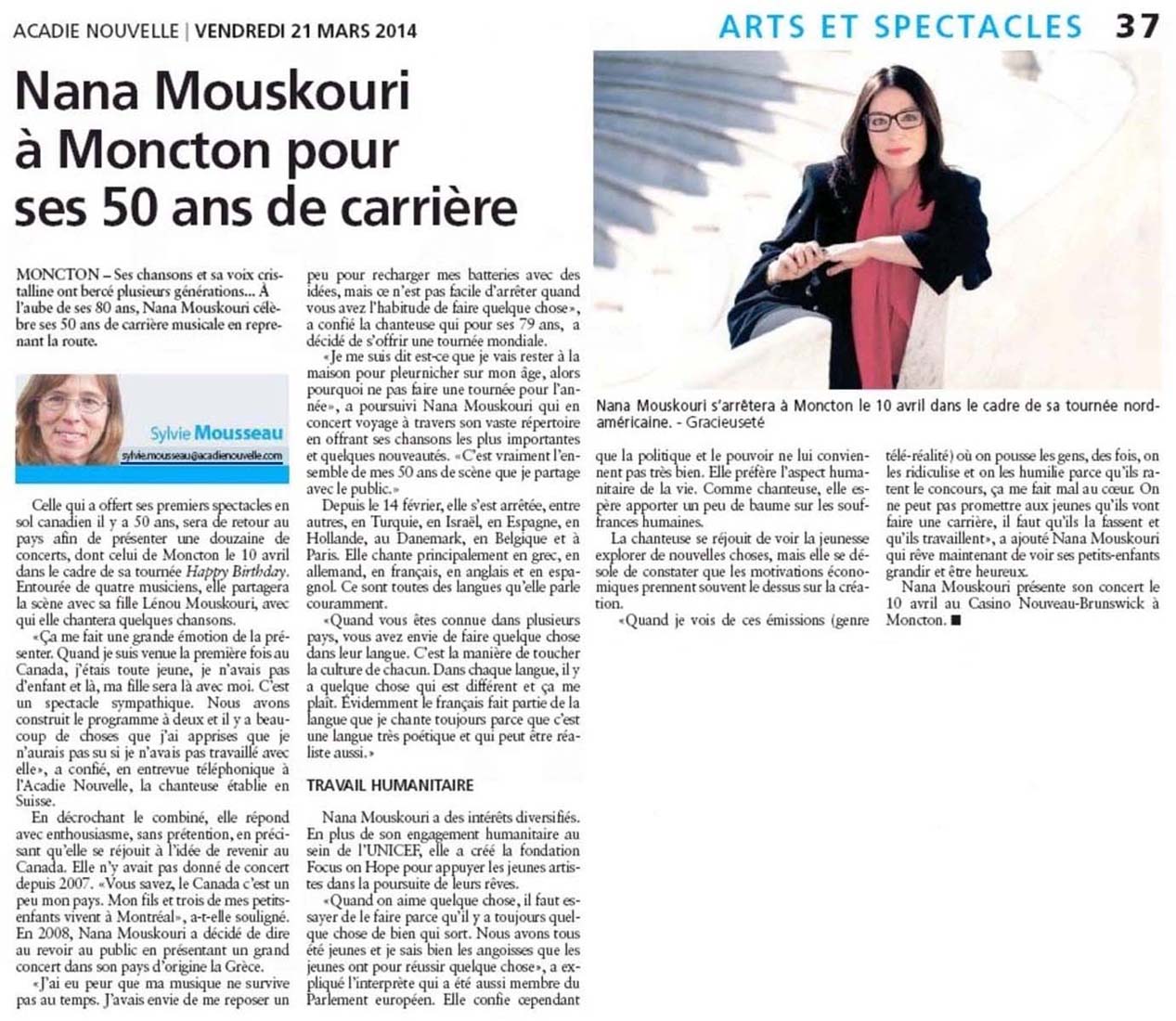 acadienouvelle.com: Nana Mouskouri, le bonheur retrouvé (11. April 2014)