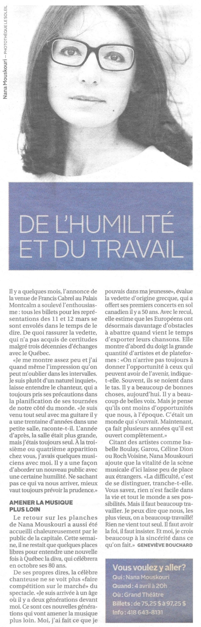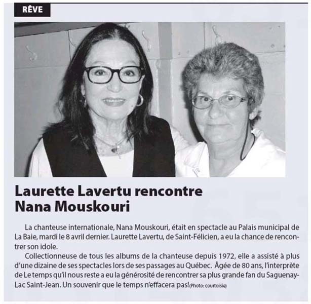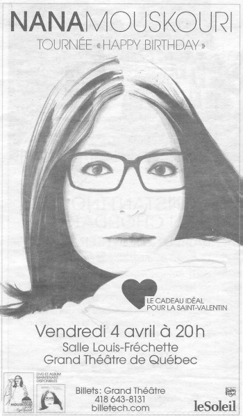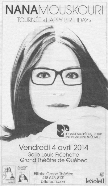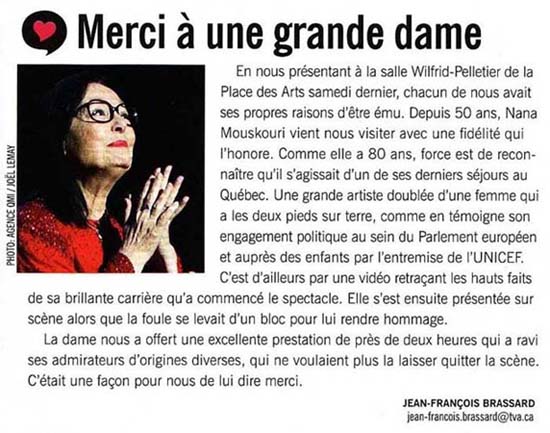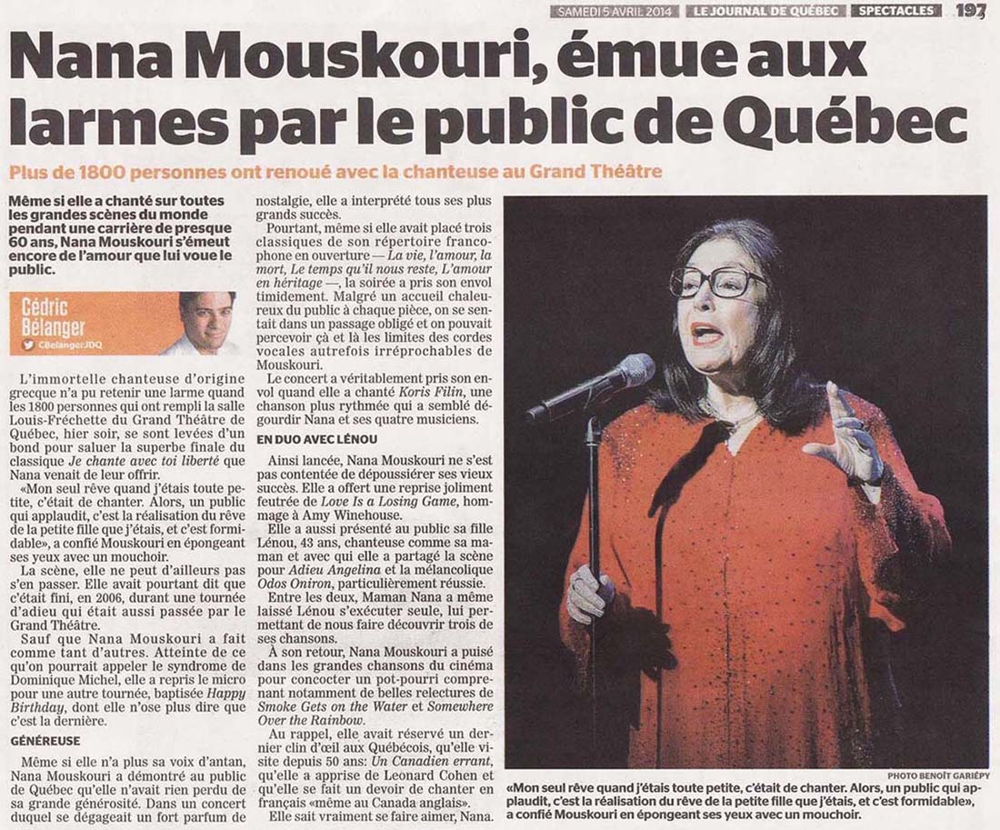 journaldemontreal.com: Nana Mouskouri, émue aux larmes par le public de Québec (4. April 2014)