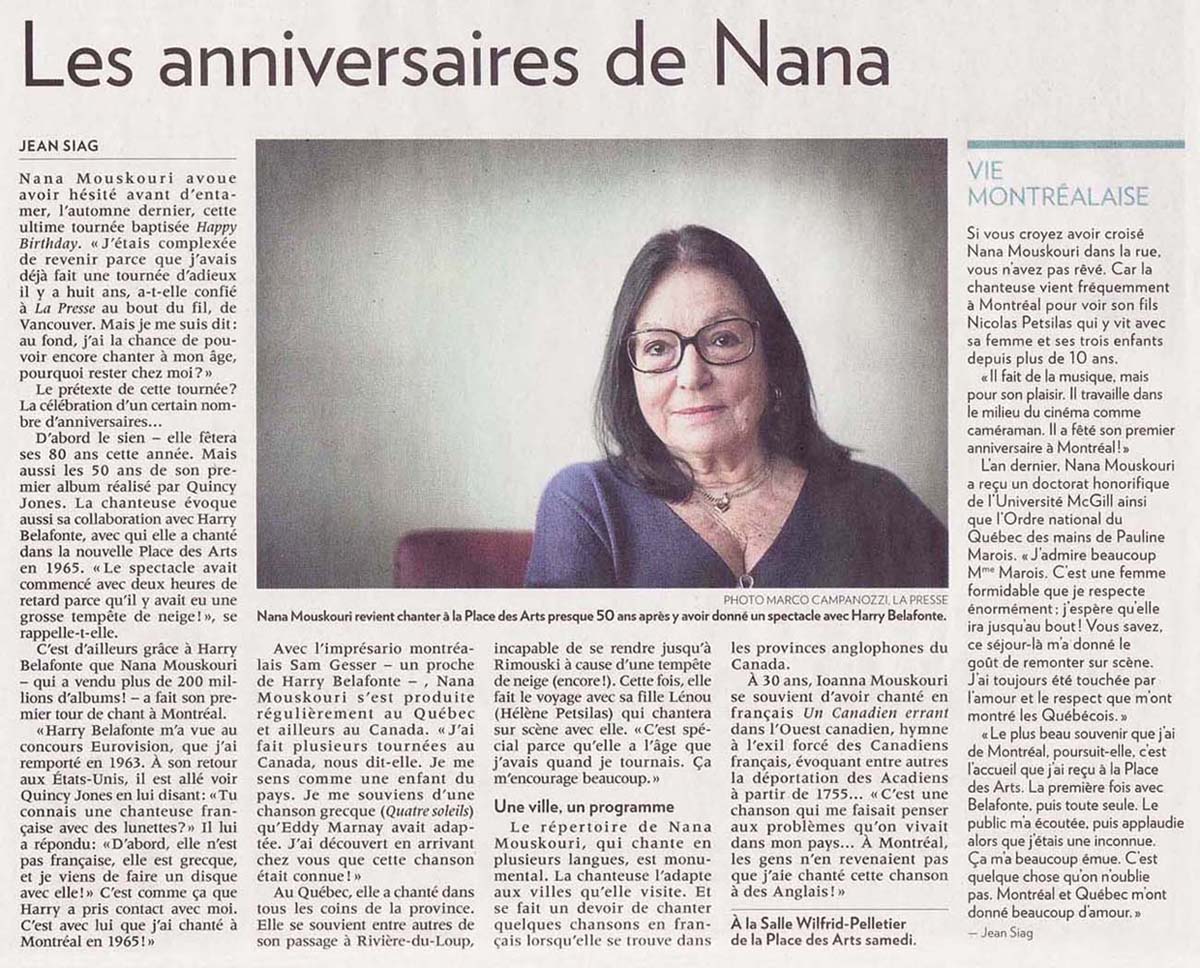 lapresse.ca: Les anniversaires de Nana Mouskouri (4. April 2014)