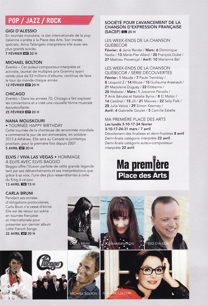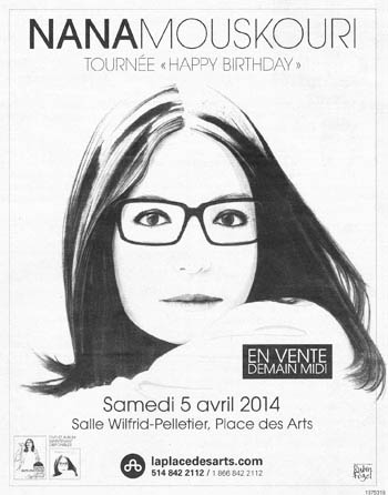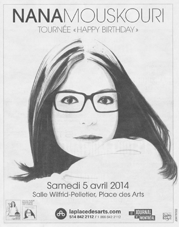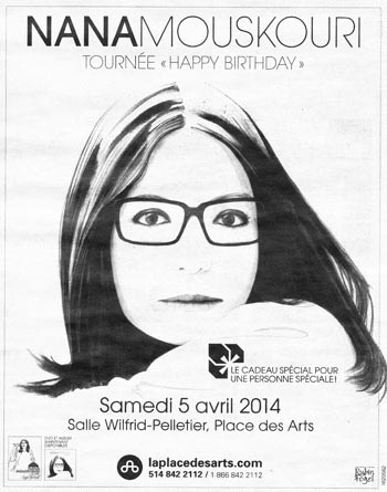 Am 5. April 2014 sah das Publikum von Montreal Nana nach acht Jahren Abwesenheit wieder. Innerhalb zweier Stunden versammelten sich 3.000 Zuschauer im Saal Wilfrid-Pelletier, und sie ließen sich durch ihre Stimme, ihre Gegenwart und ihre Großzügigkeit verzaubern. Was für ein Glück da zu sein, um es zu erzählen! |