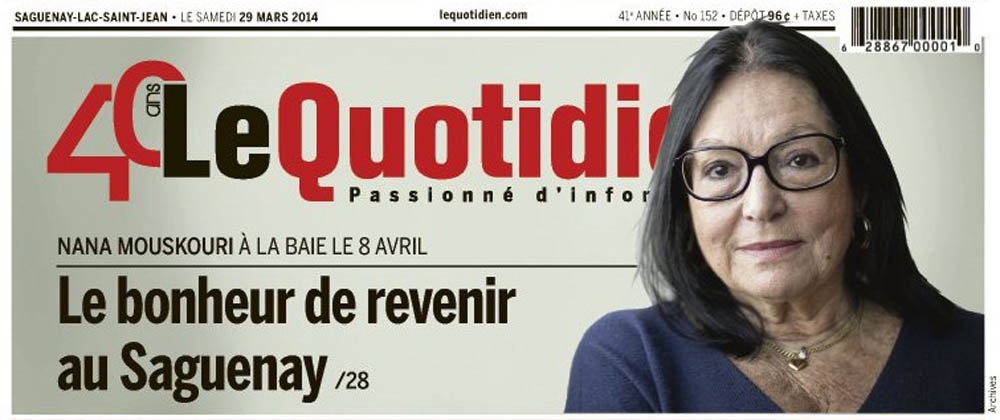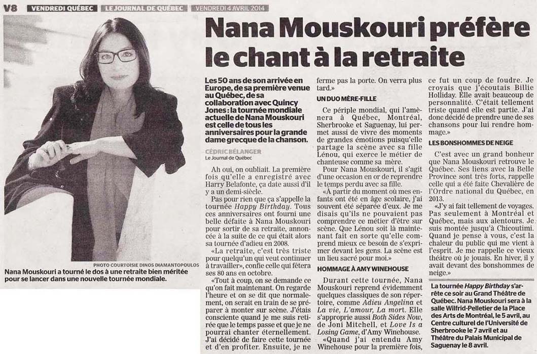 journaldemontreal.com: Nana Mouskouri préfère le chant à la retraite (3. April 2014)