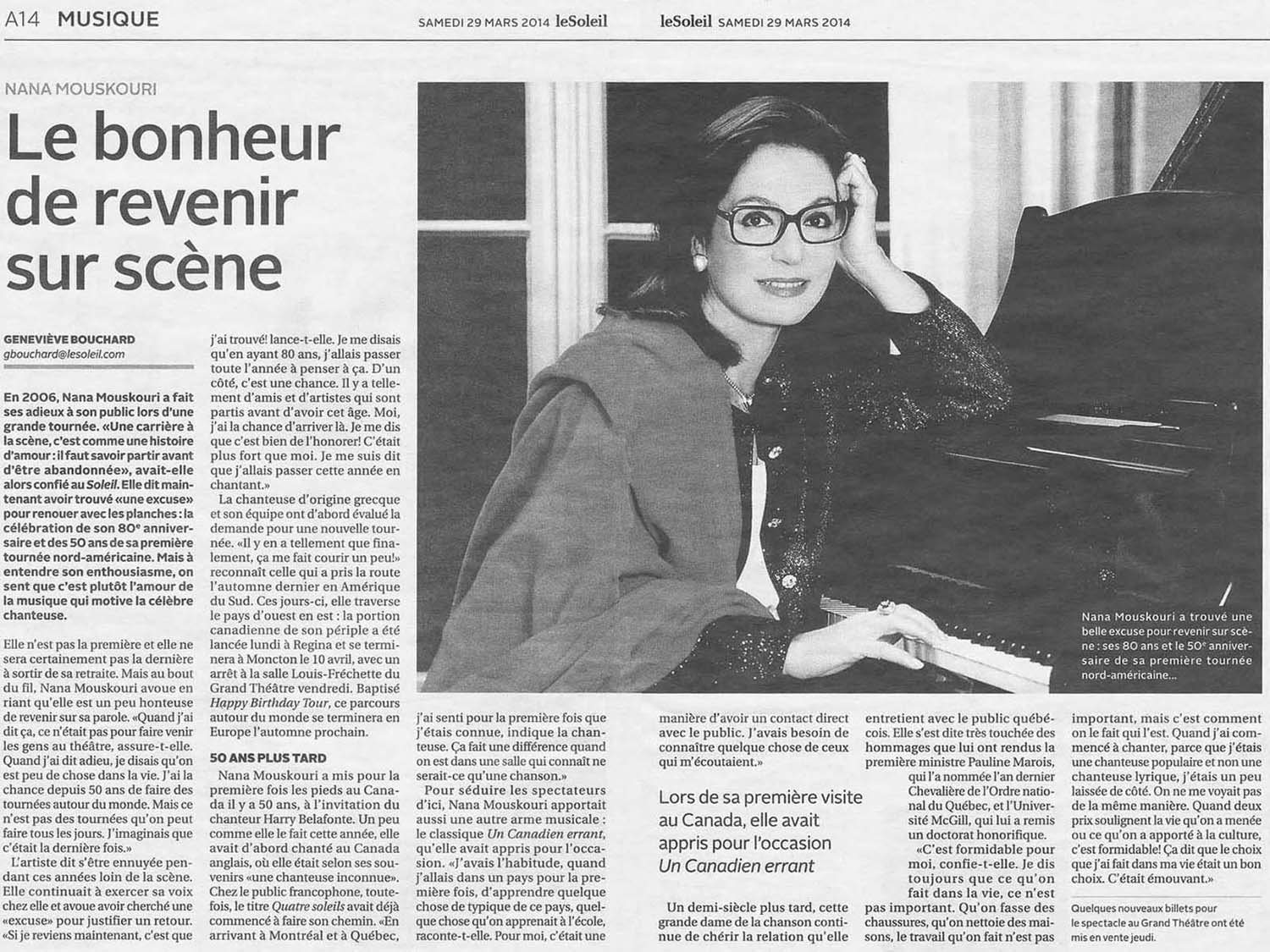 lapresse.ca: Nana Mouskouri: le bonheur de revenir sur scène (29. März 2014)