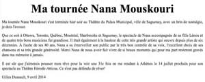 Ein Abend, gefüllt mit Anekdoten und Liedern, beginnt. Nana unterstreicht unter anderem die 50 Jahre der Place des Arts. Im Jahr 1965 trat sie mit Harry Belafonte auf. Sie würdigt ihn durch Singen "Try to remember", und tut das gleiche für die spätere Amy Winehouse mit "Love is a losing game", ein unveröffentlichtes Lied. Wie in jeder Stadt stellt ihr internationales Repertoire einen wichtigen Teil des Programms dar. In Quebec singt sie einige ihrer großen frankophonen Erfolge wie "Le temps qu'il nous reste" und "Je chante avec toi liberté" und zwei unserer Lieder: "Je reviens chez nous" und "Un Canadien errant". Einige neue Arrangements überraschen uns, und ihre Tochter Lénou singt mehrere Duette mit ihr. |