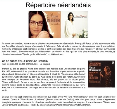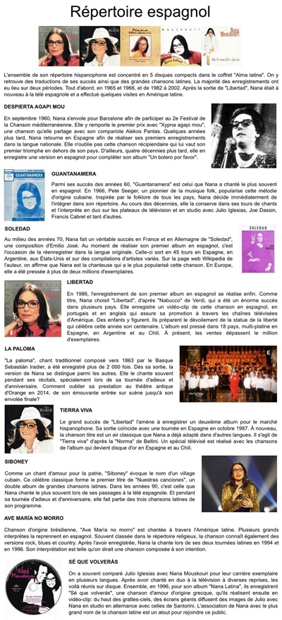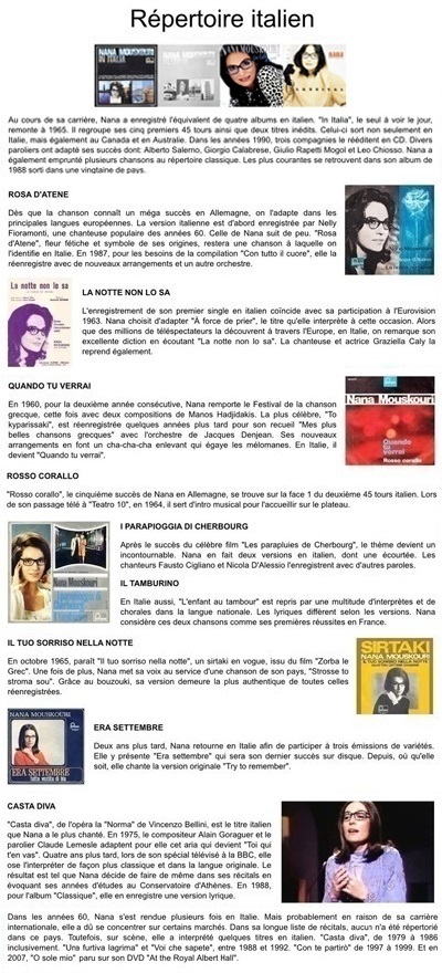 Dans un précédent article, je rendais hommage à certaines chansons qui ont marqué les débuts de Nana. Il serait intéressant de faire une suite en évoquant tous les autres succès en français, anglais, grec ou allemand. Mais cette fois-ci, je décide plutôt de mettre à la une quatre répertoires qui ont permis à Nana d'élargir ses possibilités et son public. Que ce soit en espagnol, italien, portugais ou néerlandais, les succès se sont accumulés. |